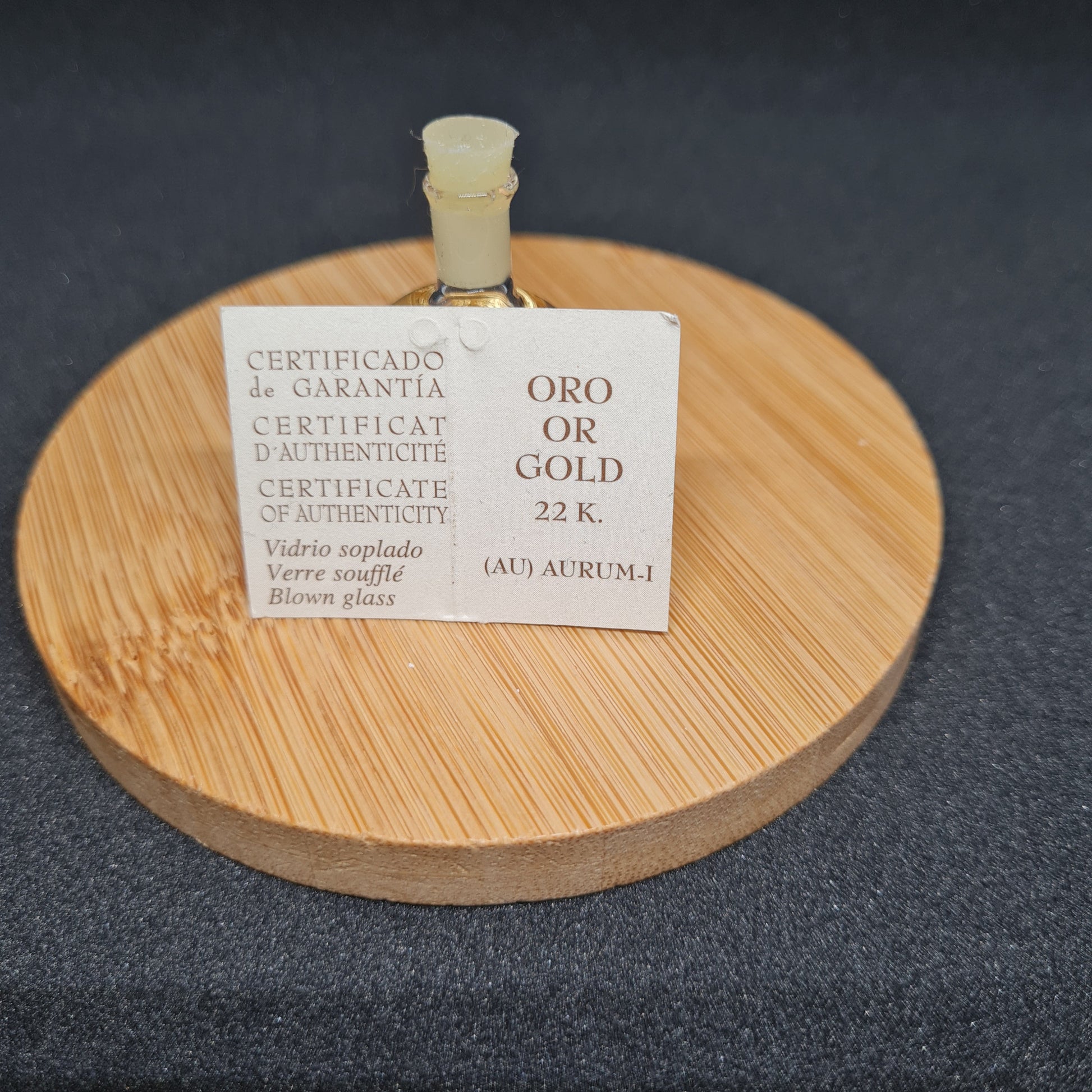 Avec des dimensions de 3,5x4,5 cm, la PETITE BOUTEILLE RONDE DE FEUILLES D'OR s'intègre harmonieusement dans n'importe quel environnement. Que ce soit sur une étagère, un bureau ou une table de chevet, elle attirera tous les regards et suscitera des conversations. Sa présence apporte une touche de luxe et d'élégance à vos espaces tout en restant discrète.